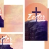 Visualize the triumph of Easter morning with this breathtaking church media graphic featuring a cross standing victorious atop a dramatic mountain against a glorious sunrise. This photo-driven design uses hand-brushed typography, soft pastel clouds, and symbolic birds in flight to create an uplifting announcement for your Easter services.