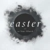 This church media graphic evokes a contemplative mood with its central, diffuse burst of dark particles, encircling a clear, minimalist text that quietly proclaims “Easter,” suggesting reflection and renewal.
