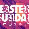 Bold gothic lettering reading “Easter Sunday” pops against a vibrant purple and orange textured background, with simple icons representing key symbols of Easter below. Perfect for sermon series graphics, Easter event promotions, or church social media posts, this design grabs attention and communicates the holiday’s significance. Fresh, creative artwork like this gives your church media a professional, welcoming feel.
