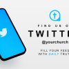 The social graphic features a clean, modern design with a smartphone displaying the Twitter logo against a white background, accented by a subtle blue cross icon and bold black text. Ideal for promoting church social media accounts, it encourages followers to connect and engage with daily spiritual content. Practical for boosting online presence, this design enhances communication and outreach through effective church media.