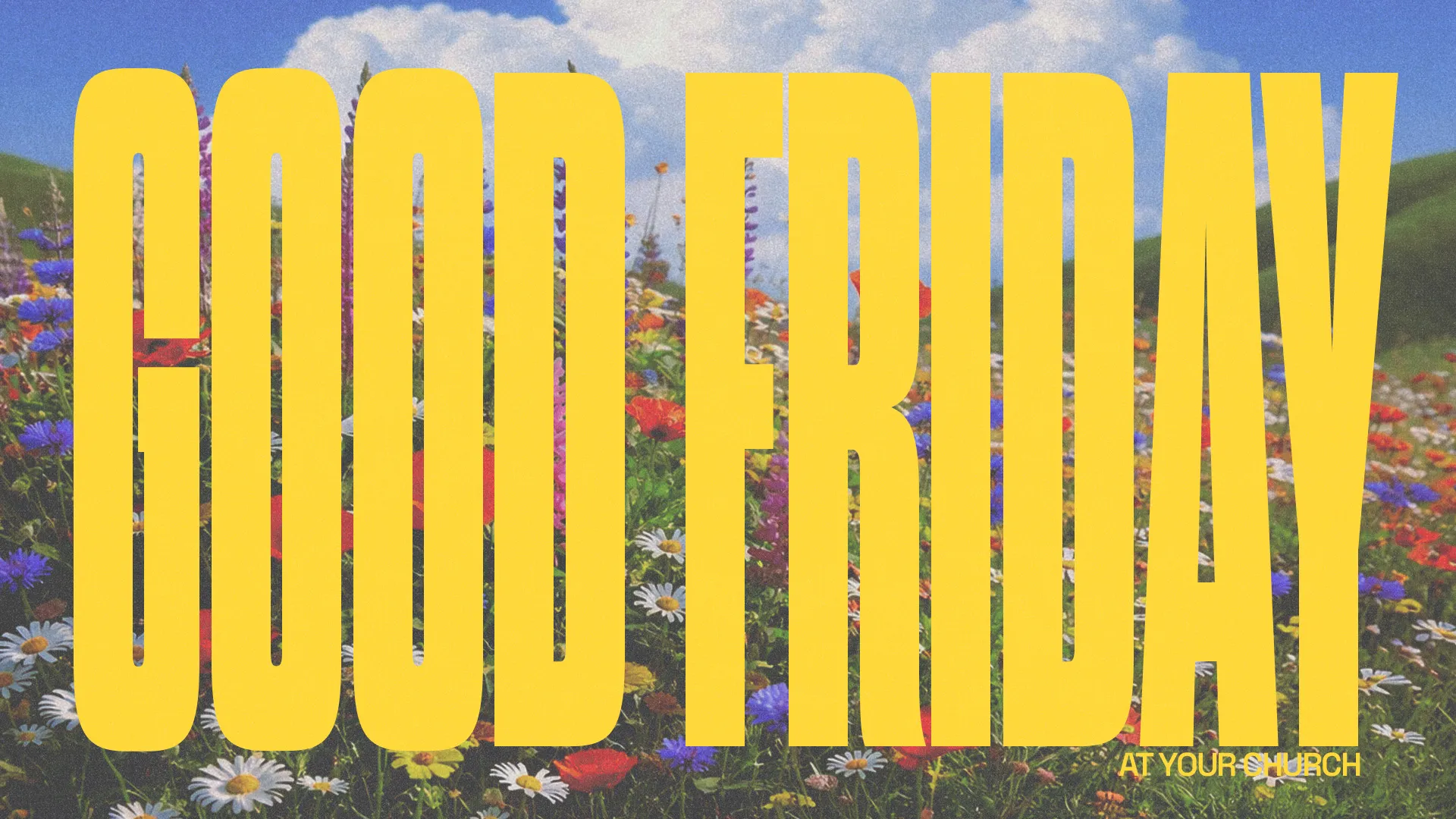 Communicate your Good Friday service details with this clean, minimalist church media graphic featuring bold typography and a serene sky image. This type-driven design uses a circular element with repeating text around the perimeter to create visual interest while maintaining a solemn, reflective mood appropriate for this sacred observance.