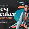 The design features a modern guest speaker announcement with bold typography, vibrant blue and orange accents, and a professional portrait set against a dynamic abstract background. Ideal for promoting special sermon series, guest events, or social media engagement posts within church communities. Utilizing church media like this enhances outreach efforts and creates a polished, inviting look for any ministry occasion.