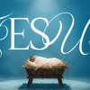 A sermon series graphic features a peaceful nativity scene with a newborn in a manger, set against a calming blue background and bold, elegant typography spelling “JESUS.” Perfect for Christmas teaching series, promotional campaigns, or social posts to highlight the birth of Christ. Draw attention and inspire your congregation with professional, meaningful church media.
