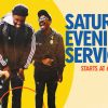 Bright and lively, this event graphic features a joyful group of friends against a colorful, modern background with bold blue and orange text announcing a Saturday evening service starting at 6 PM. Perfect for promoting weekend worship gatherings, social media posts, or church event reminders. Utilizing church media like this helps create inviting, relatable content that boosts community connection and attendance.