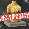 A festive event graphic features a golden ugly Christmas sweater trophy against a dark background with snowflakes, using bold red and white text for a playful holiday vibe. Perfect for promoting church ministry contests, youth events, or seasonal engagement posts. This design enhances community connection and fun through effective church media.